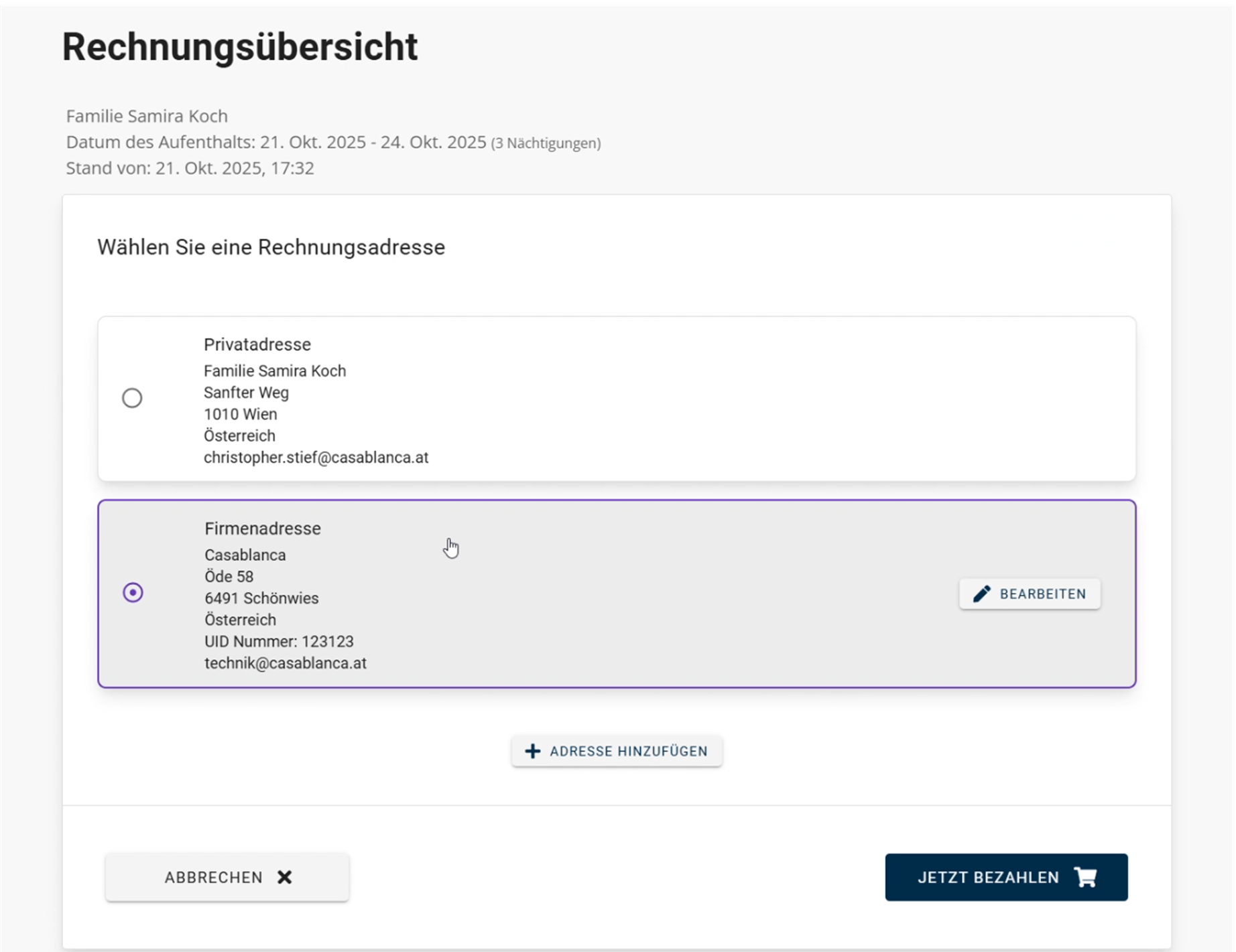 - Ebenso kann bei der Onlinezahlung auch die Rechnungsadresse angepasst werden