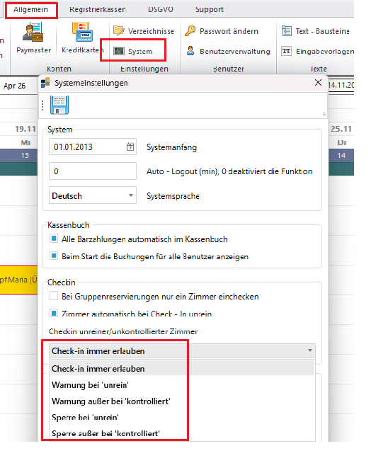 Allgemein -> System -> Checkin unreiner/unkontrollierter Zimmer