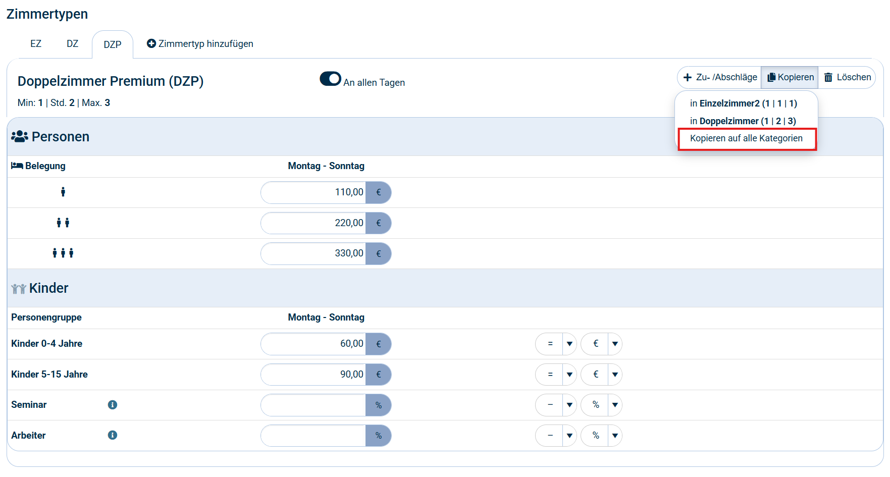 - Auf alle kopieren: Statt Preise für jede Kategorie einzeln zu kopieren, kann nun über die neue Option "Alle" ein Preis auf sämtliche Zimmerkategorien gleichzeitig übertragen werden.